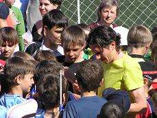 Ближе к закрытию турнира наша команда заняла место на трибуне. На поле в это время шли матчи за призовые места. Человек, переодетый в белого медведя, раздающий флажки от партии «Единая Россия», отвлек на себя их внимание. Получив из рук медведя флажки, они уже были счастливы. Как вдруг… Звонкий крик бегущего вдоль трибун мальчишки: «Дядя Жора, дядя Жора, там Смертин приехал!, - заставил всех повернуть головы ко входу. Из-за плотного кольца поклонников, журналистов Алексея практически не было видно. Вспышки фотокамер и протянутые к нему руки сделали невозможным пробиться к футболисту. Что началось на стадионе! Шум, гвалт. Кто подставлял под автограф мячи, кто – футболки, флажки, спины. Нескольким нашим мальчишкам все-таки удалось зять автограф у Алексея. В это время на стадионе появился и В.М. Красилов. Вдвоем с Алексеем Смертиным они присели на трибуну к нашим ребятам, чтобы сделать несколько снимков на память. Мечта сбылась, гордость отечественного футбола, наш земляк останется теперь в памяти у юных кытмановских футболистов на всю жизнь.