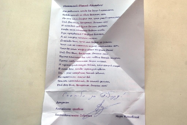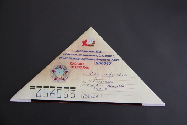 Депутат фракции КПРФ Марк Козловский в преддверии празднования 70-летия Победы над фашисткой Германией поздравил ветеранов войны Барнаула стилизованным под фронтовой треугольник письмом со словами благодарности и уважения.
