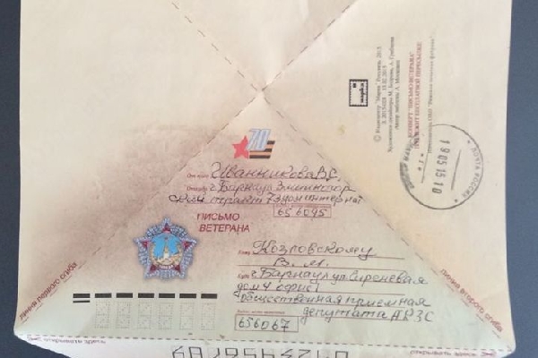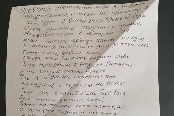 После майских праздников общественную приемную депутата по ул. Сиреневая, 4 почтальон в течении нескольких дней приносил письма от ветеранов с ответными поздравлениями и признательностью за внимание. Особенно его тронуло коллективное послание из Барнаульского дома-интерната для престарелых и инвалидов (ветеранов войны и труда).