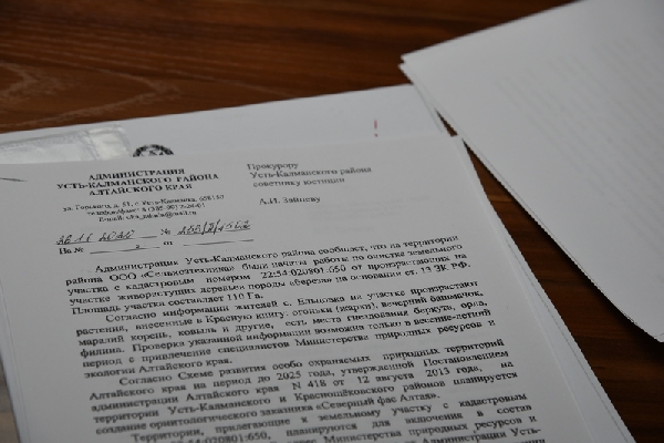 Специалистам Управления мелиорации земель и сельскохозяйственного водоснабжения по Алтайскому краю рекомендовано отозвать согласование на проект мелиорации земель в Усть-Калманском районе в связи с наличием на этом участке краснокнижных птиц и растений и необходимостью проведения дополнительной экспертизы Министерством природных ресурсов и экологии региона. Также предлагается в будущем согласовывать проекты мелиорации земель, направленные на вырубку древесно-кустарниковой растительности на землях сельскохозяйственного назначения, только после предварительного их согласования с Минприроды, Минсельхозом и администрацией муниципалитета, на территории которого находится данный участок.