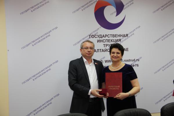 Награждая Почетной грамотой Алтайского краевого Законодательного Собрания заслуженного сотрудника Инспекции, Марк Козловский пожелал от имени председателя АКЗС Ивана Лоора и в дальнейшем проявлять принципиальность в отношении злостных нарушителей трудового законодательства, при этом помогая начинающим предпринимателям советом и рекомендациями в создании системы охраны труда на новых предприятиях. Тем более, что такая практика взаимодействия между профильным комитетом АКЗС и Инспекцией сформирована и показала свою эффективность в процессе подготовки и проведения совместных мероприятий, направленных на информирование предпринимательского сообщества Алтайского края.
