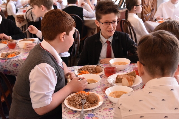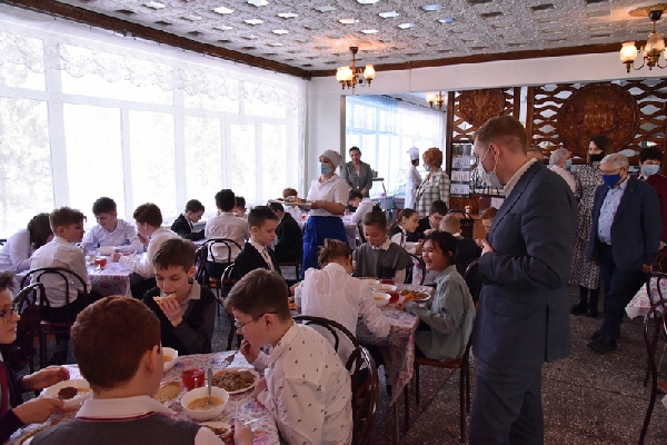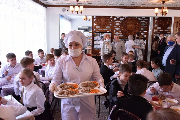 Перед началом совещания участники встречи посетили столовую гимназии и вместе с ученикам попробовали предложенные на обед блюда.