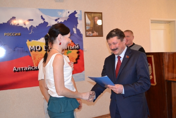 В рамках посещения района состоялось торжественное вручение свидетельств «О праве на получение социальной выплаты на приобретение либо строительство жилья» по государственной программе «Обеспечение жильем молодых семей в Алтайском крае на 2011-2015 годы».