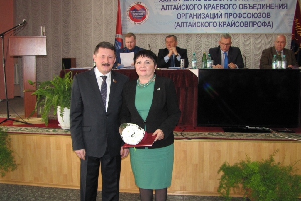 Выполняя почетную миссию, Андрей Осипов вручил награды АКЗС председателю краевой организации профсоюза работников государственных учреждений и общественного обслуживания Валентине Назиной и председателю барнаульской городской организации профсоюза работников народного образования и науки Тамаре Лесовых.