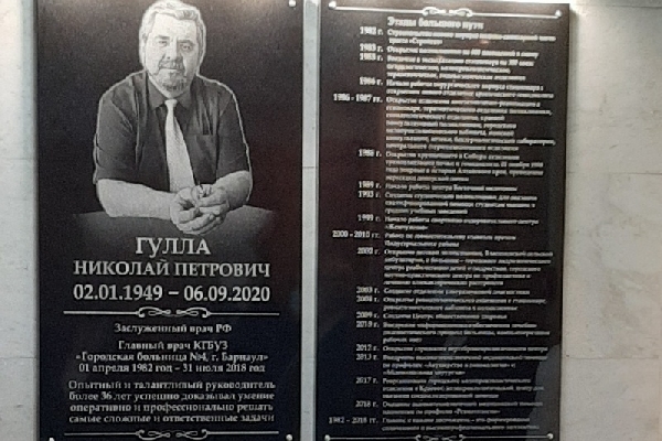 На прошлой неделе председатель Алтайского краевого Законодательного Собрания Александр Романенко подписал постановление о присвоении Городской больнице №4 г. Барнаула имени Николая Петровича Гулла. 24 декабря, в Горбольнице состоялось открытие мемориальной доски, посвященной бывшему главному врачу.
