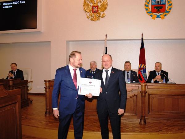 В начале сессии сенатор вручил благодарности Председателя Совета Федерации Валентины Матвиенко заместителю председателя комитета АКЗС по бюджету налогам Сергею Прибу, главе Барнаула Сергею Дугину отметив, что столица края активно развивается, а по итогам 2018 года город Барнаул стал победителем Всероссийского конкурса «Город - территория детства».