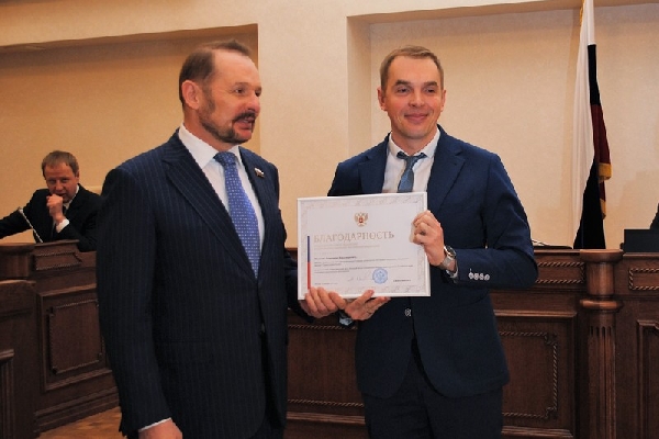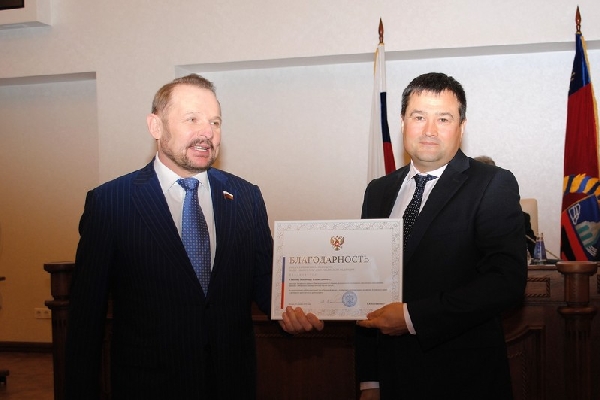 Сенатор вручил благодарности Председателя Совета Федерации Валентины Матвиенко депутатам Владимиру Семенову, Александру Молотову и Александру Демину, отметив их большой вклад в социально-экономическое развитие Алтайского края.