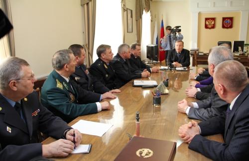 Глава региона в ходе общения с гостями обратил внимание на значимость данной акции и правильную организацию работы. В рабочей встрече также приняли участие заместитель начальника управления кадров Пограничной службы ФСБ России Александр Морозов, заместитель Губернатора края Борис Ларин. В ходе общения состоялся обмен сувенирами.