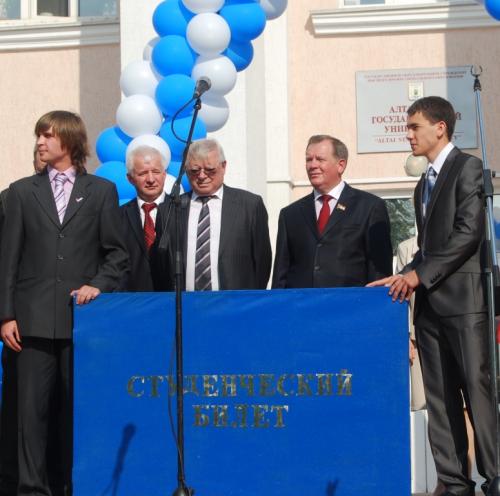 Традиционной стала и встреча председателя АКЗС 1 сентября со студентами аграрного университета. Около памятника Михаила Лисавенко собрались все первокурсники разных факультетов университета: агрономический, ветеринарный, инженерный, экономический и биолого-технический менеджмент. Первым взял слово ректор Аграрного университета - Сергей Макарычев. Он заверил, что выбор аграрного университета - это правильный выбор. «В вашем лице, уважаемые первокурсники, мы видим будущее края, залог нашего процветания. Уверен, что окончив университет, вы обязательно останетесь работать на Алтае», - сказал ректор.
