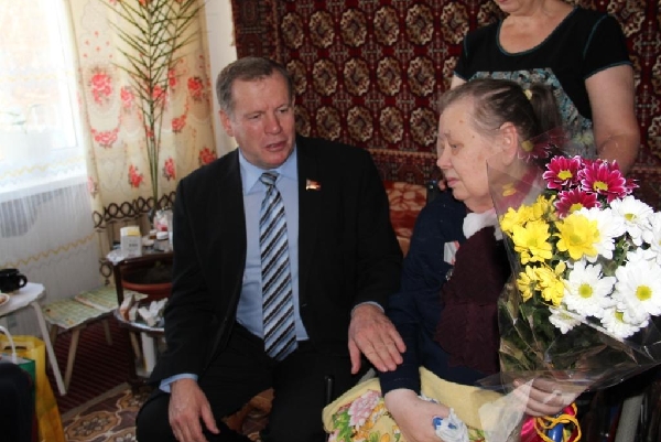 Но перед тем, как принять участие в торжественном мероприятии он навестил одну из "ровесниц края" дома - по состоянию здоровья Валентина Иосифовна Павлиева не может принять участие в общем празднике. Между тем Валентина Иосифовна - ветеран труда Алтайского края, ее трудовой стаж составляет более 40 лет.