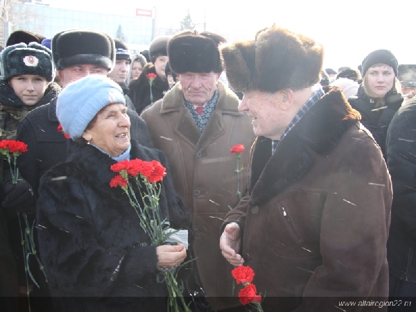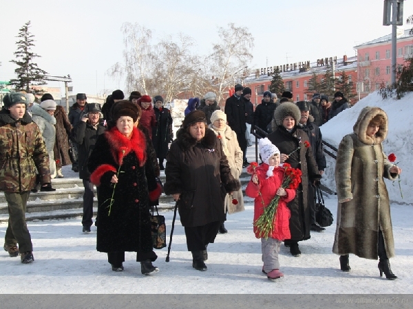 Возложить цветы к Мемориалу Славы пришли Губернатор Алтайского края Александр Карлин, председатель Алтайского краевого Законодательного Собраний Иван Лоор, заместитель председателя АКЗС Андрей Осипов, руководители краевых и городских органов власти, представители ветеранских организаций, активисты общественных и военно-патриотических объединений.