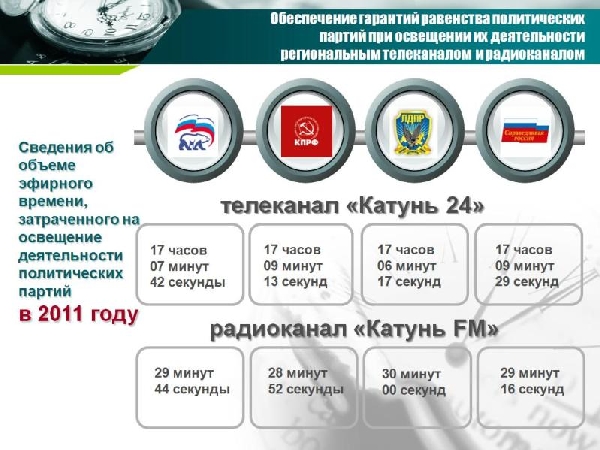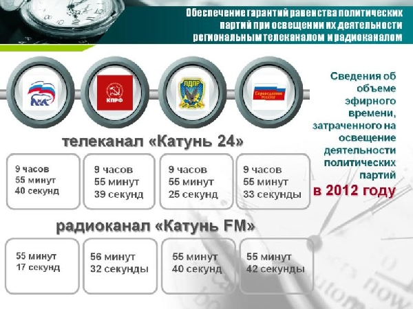 «Избирательная комиссия Алтайского края проводит постоянную работу по информированию представителей средств массовой информации, региональных отделений политических партий об исполнении Закона на территории края. Для сведения избирателей соответствующая информация размещается в сети Интернет, годовые сведения по учету объема эфирного времени публикуются в газете «Алтайская правда». Анализ данных по учету объема эфирного времени за 2011-2012 годы, отсутствие жалоб и иных обращений со стороны региональных отделений политических партий свидетельствуют о том, закон Алтайского края «О гарантиях равенства политических партий, представленных в Алтайском краевом Законодательном Собрании, при освещении их деятельности региональными телеканалом и радиоканалом» реализуется в Алтайском крае в полном объеме», - заключила председатель Избирательной комиссии Алтайского края.