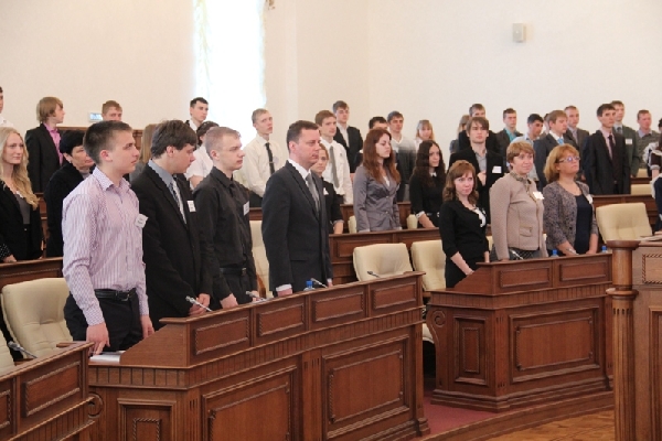 «Дорогие друзья, наши уроки также посвящены и 20-летию принятия Конституции Российской Федерации, которое мы отметили в декабре 2013 года», - продолжил урок председатель АКЗС. - «Вы на занятиях в школе уже получили общее представление о политической системе нашей страны. Но как говорится, «лучше один раз увидеть». И после визита в краевой Парламент вам будет легче понять, как реализуются заложенные в Конституции принципы народовластия, как работают избранные народом государственные органы. А ведь вы - будущие избиратели».
