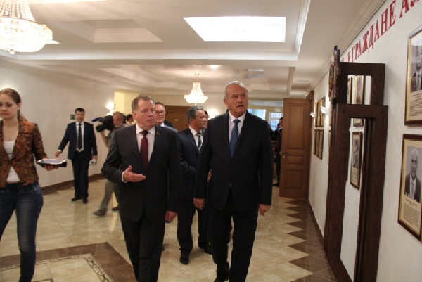 Председатель Алтайского краевого Законодательного Собрания Иван Лоор познакомил гостей из Таджикистана с Парламентским центром, показал рабочие кабинеты фракций, комнаты для личных приемов и для прессы, залы заседаний, включая главный, в котором проводятся сессии Законодательного Собрания. Далее состоялась встреча таджикской стороны и депутатов, председателей комитетов АКЗС. Руководители обменялись символическими подарками. Спикер краевого парламента вручил Абдурахмону Кодири настенное панно ручной работы с видами Барнаула, Председатель Согдийской области - пару клинков ручной работы.