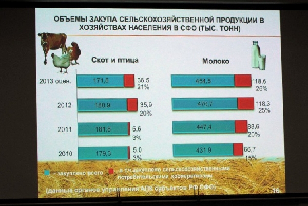 На сегодняшний день в Сибири действуют более тысячи сельскохозяйственных потребительских кооперативов разных форм: сбытовые, снабженческие, перерабатывающие и т.д. В целом по округу доля кооперативов в общем объеме закупленного молока и мяса у населения чуть выше 20%, хотя в некоторых регионах достигает 70-80%.