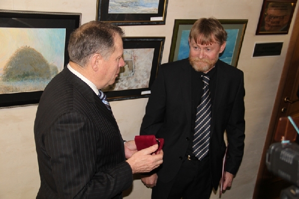 Пользуясь случаем председатель АКЗС поздравил художника, которому буквально на днях исполнилось 50 лет, с юбилеем, вручил Почетную грамоту Алтайского краевого Законодательного Собрания и пожелал дальнейших творческих успехов.