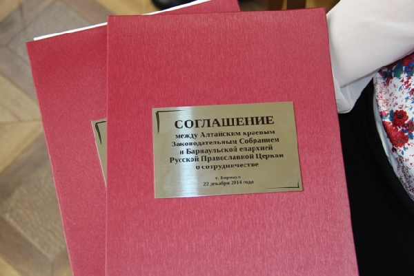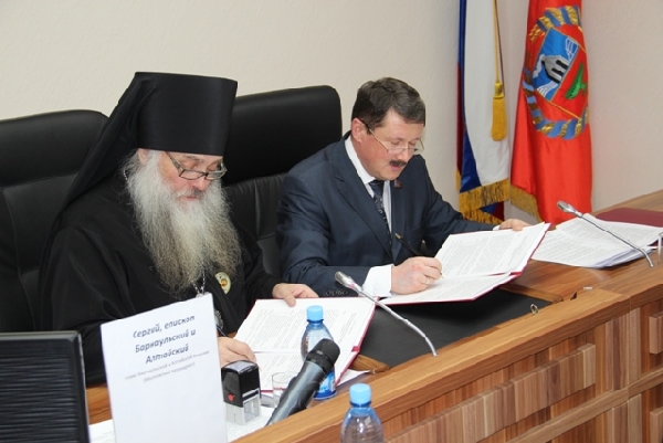 Открылась встреча подписанием Соглашения о сотрудничестве между Алтайским краевым Законодательным Собранием и Барнаульской епархией Русской Православной Церкви, в рамках которого в дальнейшем стороны планируют осуществлять работу в поддержку семьи, материнства и детства.