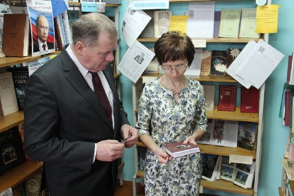 Иван Лоор вручил Ольге Бортниковой благодарность от краевого Законодательного Собрания, памятный подарок, а также книгу «Алтайский край в лицах» для фонда библиотеки.