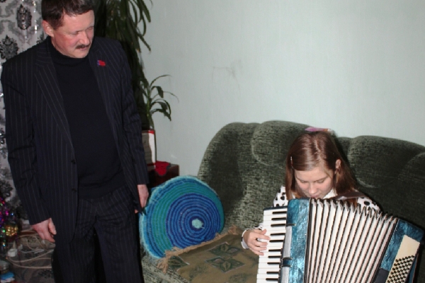 Девочка из многодетной семьи учится в десятом классе Бийской специальной (коррекционной) школы для слабовидящих детей. Она уже успешно окончила музыкальную школу по классу аккордеона, занимается вокалом, сочиняет песни и мечтает продолжить своё обучение в Бийском музыкальном колледже. На каникулы и в выходные Людмила приезжает к своей бабушке Надежде Петровне Прокопенко в п. Октябрьский. Нет, писем Деду Морозу Люда не писала, но мечтать об инструменте не переставала. Для дальнейших занятий музыкой ей просто необходим аккордеон. Об этом сокровенном желании она и рассказала своей тёте, которая приезжала к бабушке в гости. А уже она-то и написали об этом депутату. Поиски проходили довольно сложно: хороший инструмент стоит непосильных денег для обычной семьи, да и магазинные полки таким товаром не завалены.