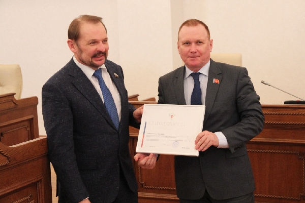 За многолетний добросовестный труд, большой вклад в социально-экономическое развитие Алтайского края благодарностью Председателя Совета Федерации Федерального Собрания Российской Федерации был поощрен председатель постоянного комитета АКЗС по бюджету и налогам Владимир Устинов.