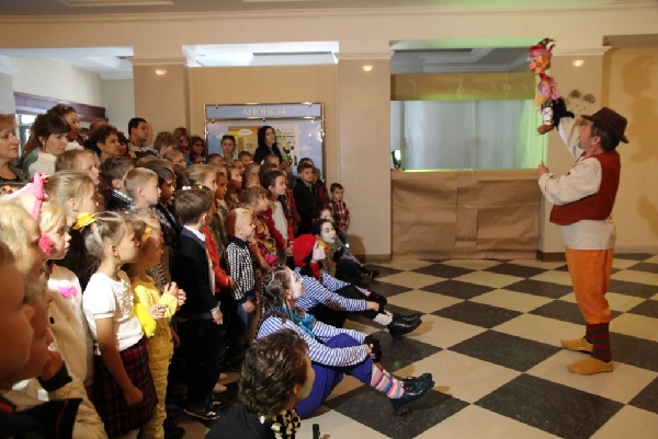 Сегодня ребята впервые увидели «Денискины рассказы», постановку по мотивам произведений Эмиля Драгунского. А перед началом постановки в холле театра их приветствовали актеры «Сказки».