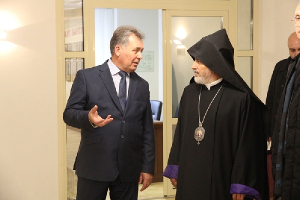 Сегодня, 19 октября, в Парламентском центре Алтайского края прошла встреча председателя Алтайского краевого Законодательного Собрания Александра Романенко с чрезвычайным и полномочным послом Республики Армения в Российской Федерации Варданом Тоганяном. Участие в мероприятие также принимали глава Российской и Ново-Нахичеванской епархии армянской апостольской церкви архиепископ Езрас, врио заместителя Председателя Правительства - руководителя Администрации Губернатора и Правительства Алтайского края Виталий Снесарь, председатель краевой общественной организации «Армянский культурный центр» Мхитар Ароян.