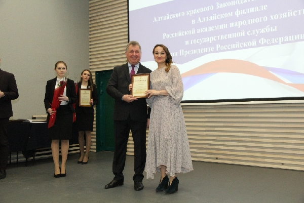 Председатель АКЗС также вручил награды краевого парламента сотрудникам вуза. Благодарностью председателя АКЗС были награждены директор Алтайского филиала Игорь Панарин, заведующая библиотекой Ольга Долматова, директор центра информационных систем и технологий Антон Кузиков, декан юридического факультета Татьяна Полещенкова, а также студенты Дарья Конюкова, Михаил Ларионов, Владимир Пустовалов, Роман Румянцев и Варвара Эрмиш. Почетные грамоты АКЗС были вручены заведующей кафедрой гуманитарных и естественнонаучных дисциплин Ларисе Лысенко и заместителю директора по научной работе Светлане Шлегель, Благодарственное письмо АКЗС - рабочему по зданию Юрию Позднякову.