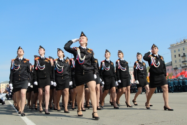 На площадь Советов внесли государственный флаг Российской Федерации и Знамя Победы.Торжественным маршем прошли парадные расчеты кадетских корпусов, войсковых частей и силовых структур Барнаульского гарнизона. Плац-показом приветствовал взвод почетного караула Барнаульского юридического института МВД России. Мероприятие проходило под музыку в исполнении духового оркестра города.