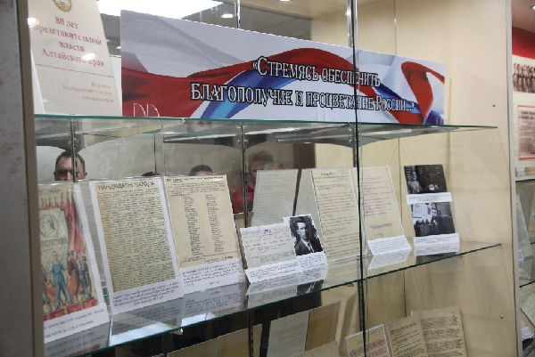 Сегодня в краевом Законодательном Собрании прошло открытие выставки архивных документов «Стремясь обеспечить благополучие и процветание России...», подготовленной Государственным архивом Алтайского края и посвященной истории представительной власти Алтайского края.