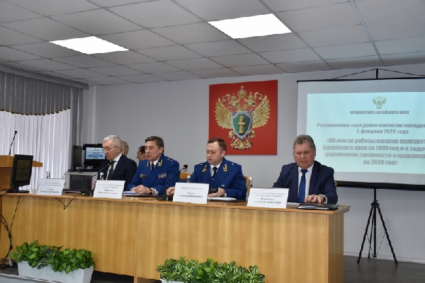 В расширенном заседании коллегии, которое прошло 5 февраля, приняли участие прокуроры городов и районов края, спикер Алтайского краевого Законодательного Собрания Александр Романенко и заместитель Председателя Правительства региона Виталий Снесарь. В ходе собрания обсуждались итоги работы надзорных органов в минувшем году и планы краевой прокуратуры на 2020 год.