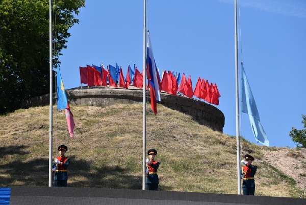 Курсанты роты почетного караула Барнаульского юридического института МВД России пронесли многометровое знамя Российской Федерации от улицы Молодежной к центральной части площади Сахарова. Под звуки государственного гимна флаг Российской Федерации вместе с флагами Алтайского края и города Барнаула подняли над площадью.⠀