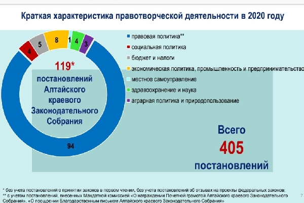 Наибольшую долю от общего количества инициатив краевого Законодательного Собрания в 2020 году, как и в предыдущие годы, разработал и внес комитет Алтайского краевого Законодательного Собрания по правовой политике.