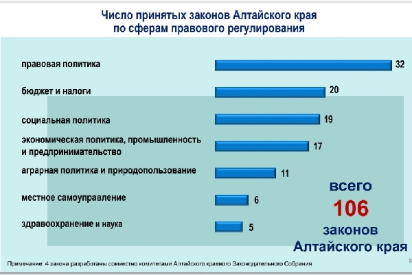 В докладе отмечается, что комитеты АКЗС в большинстве случаев самостоятельно участвуют в законотворческом процессе. Вместе с тем в 2020 году 16 законопроектов было внесено совместно с другими субъектами права законодательной инициативы, в том числе 6 -совместно с Губернатором Алтайского края.