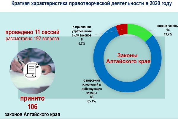 Всего в 2020 году было принято 106 законов Алтайского края. Основными субъектами права законодательной инициативы в 2020 году, как и в предыдущие годы, являлись Губернатор Алтайского края (51,9% от общего количества принятых законов) и комитеты Алтайского краевого Законодательного Собрания (25,5% от общего количества принятых законов).