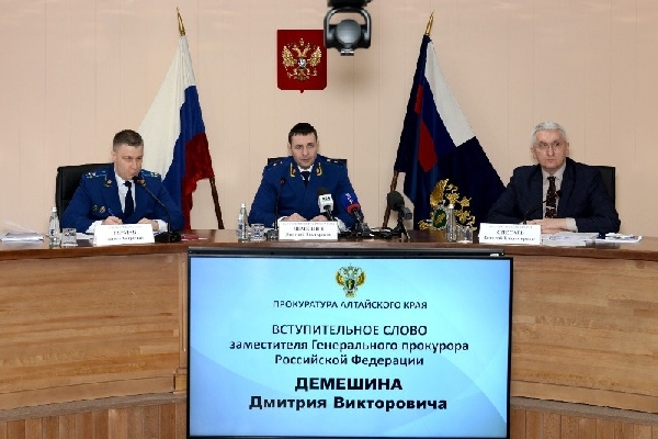 Сегодня, 21 февраля, в г. Барнауле прошло расширенное заседание коллегии прокуратуры Алтайского края, на котором подвели итоги работы ведомства за прошедший год. Заседание проводилось под председательством заместителя Генерального прокурора РФ Дмитрия Демешина. В работе коллегии участвовали прокурор края Антон Герман, исполняющий обязанности Губернатора Виталий Снесарь, председатель краевого Законодательного Собрания Александр Романенко, Главный федеральный инспектор в Алтайском крае Юрий Земский, работники прокуратуры и руководители правоохранительных органов.