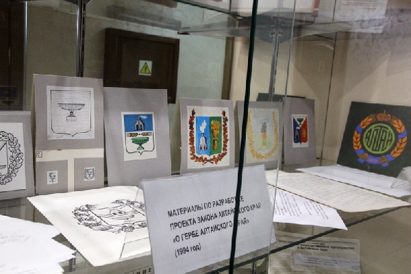 Отдельная экспозиция посвящена принятию герба Алтайского края. Работы по его разработке начались еще в первом созыве краевого Законодательного Собрания, в 1994 году. К обсуждению концепции герба были привлечены не только ученые, художники, дизайнеры, но и жители края, которые присылали в законодательный орган свои собственные предложения, написанные и нарисованные буквально на тетрадных листочках.