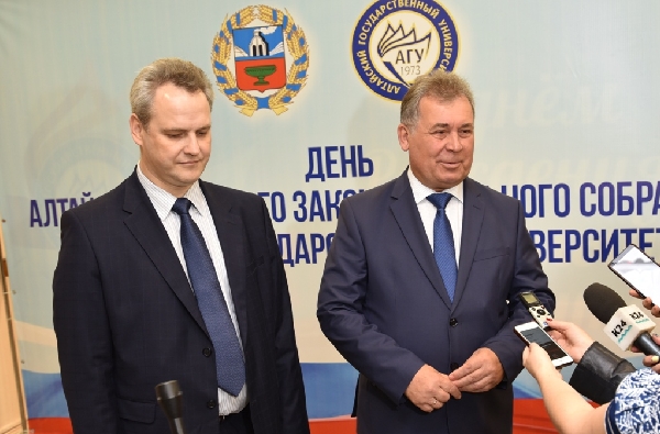 В Алтайском государственном университете 17 сентября проходит День краевого Законодательного Собрания. Председатель АКЗС Александр Романенко и врио ректора АлтГУ Сергей Бочаров рассказали журналистам о том, как будет строиться сотрудничество вуза и регионального Заксобрания.