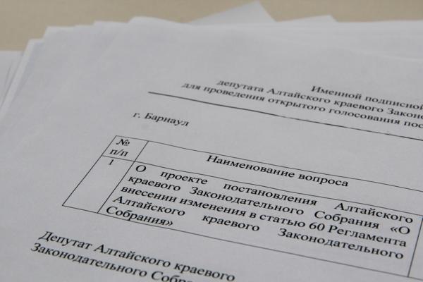 Регламент АКЗС - это нормативный правовой акт, который регулирует порядок деятельности краевого парламента, в том числе - процесс принятия законов, постановлений и иных решений. Пункт 1 статьи 60 Регламента предлагалось изложить следующим образом: «проведение опросов депутатов по вопросу принятия законов Алтайского края не допускается, за исключением периодов введения на территории Алтайского края режимов повышенной готовности или чрезвычайной ситуации».