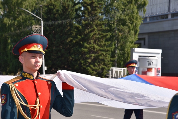 Курсанты роты почетного караула Барнаульского юридического института МВД России пронесли многометровое знамя Российской Федерации от улицы Молодежной к центральной части площади Сахарова. Под звуки государственного гимна флаг Российской Федерации вместе с флагами Алтайского края и города Барнаула подняли над площадью.⠀