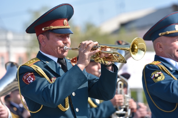Продолжилась праздничная программа на площади Советов, где состоялось шествие парадных расчетов воинских частей и силовых структур Барнаульского гарнизона.