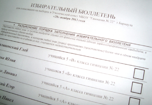 Благодаря данному мероприятию ребятам удалось принять участие практически в настоящей избирательной кампании. Для регистрации в качестве кандидатов ребятам необходимо было сдать подписные листы в поддержку выдвижения своих кандидатур, после в течение недели проходила предвыборная агитация, которая закончилась, как и положено, за сутки до дня голосования. 28 ноября в школе с 8.00 до 17.00 работал избирательный участок, где каждый мог оставить свой голос. В организации данного мероприятия приняла участие комиссия по правовым вопросам Молодежного Парламента Алтайского края, председатель комиссии Денис Голобородько отметил: "Необходимость принятия мер по правовому просвещению молодежи осознается в нашей стране на самом высоком уровне. Президент РФ в 2011 году подписал «Основы государственной политики РФ в сфере развития правовой грамотности и правосознания граждан», меры государственной политики по формированию правовой культуры и позитивного типа правосознания и поведения граждан. Считаю, проведение подобных мероприятий в школах как раз и дает возможность самого непосредственного правового просвещения школьников и формирования у них положительного отношения к институту выборов. Ребята получили возможность на практике ознакомиться с основными догмами избирательного права, приняв участие в избирательной кампании, начиная от порядка выдвижения кандидатов заканчивая правилами заполнения избирательных бюллетеней. Свои кандидатуры выдвинули 36 учеников (с 5 по 10 классы), а явка на выборах составила более 70%, что подтверждает интерес ребят к институту выборов как к способу формирования органов самоуправления".