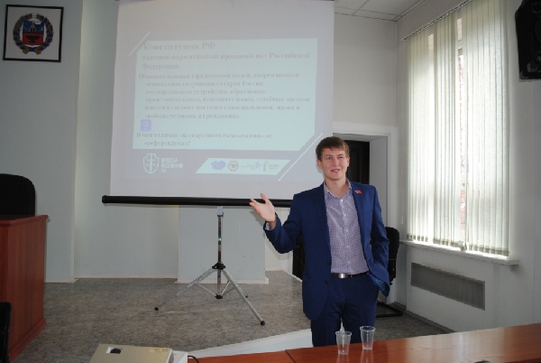 Председатель комиссии Молодежного парламента Алтайского края по правовым вопросам Денис Голобородько приветствовал участников правовой школы: «Мы рады приветствовать все собравшиеся районы: Рубцовский, Егорьевский и Поспелихинский. Надеемся, что наши лекции отложатся у вас в памяти надолго, ведь нашей главной задачей является повышать правовую грамотность молодежи, уровень электоральной активности».
