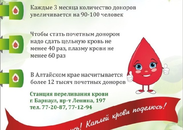 Данная акция - лишь небольшая ступень становления донорского направления Алтайского края. Мы хотим, чтобы молодежь знала, как можно больше о донорстве и не боялась сдавать кровь. Ведь для кого-то эта помощь - целая жизнь» -отметила автор проекта «Развитие донорства на Алтае», член Молодежного Парламента Алтайского края Наталья Прокудина.