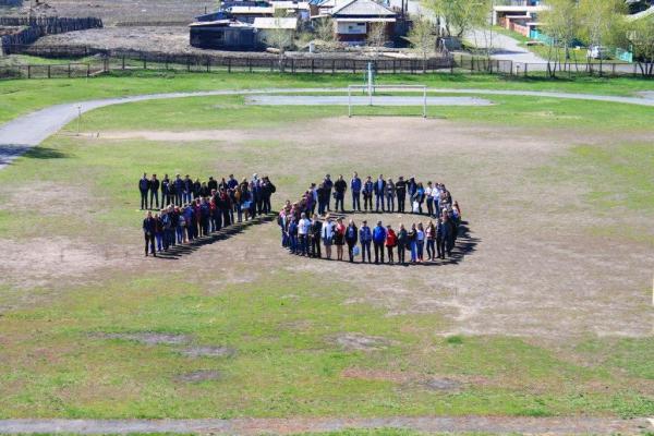 На школьном стадионе молодежь выстроилась в цифру «70», что бы почтить память тех, благодаря которым мы сейчас живем.