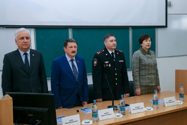 Участников конференции поприветствовали члены президиума секции: начальник института, полковник полиции Сергей Буряков, председатель комитета по правовой политике Андрей Осипов, Уполномоченный по правам человека в Алтайском крае Борис Ларин и председатель краевого Молодёжного Парламента Артём Сингач.