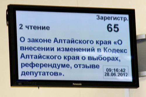Сегодня, 28 июня, на очередной сессии Алтайского краевого Законодательного собрания во втором чтении были приняты поправки в Кодекс Алтайского края о выборах, референдумах и отзыве депутатов.