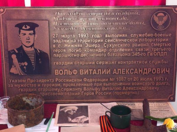 «В рамках мероприятия, 29 сентября, в селе Нижние Эшеры Сухумского района состоялось открытие мемориальной доски уроженцу Алтайского края, гвардии старшему сержанту 345 го ОПДП Виталию Александровичу Вольфу, который во время отечественной войны народа Абхазии находился в составе российских миротворческих сил. Выполняя боевое задание, Виталий попал под обстрел, и в тяжелейших условиях спас десятки жизней десантников. Посмертно нашему земляку было присвоено звание Героя России. Для меня, как для Председателя регионального отделения Союза десантников, было крайне важны, чтобы память нашего героя была увековечена на месте его гибели», - рассказал Юрий Ярцев.