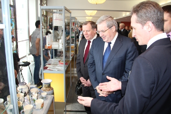 Перед началом торжественной части Александр Карлин и Иван Лоор ознакомили Николая Федорова и полномочного представителя Президента РФ в СФО Виктора Толоконского с выставкой продукции предприятий края, расположившейся в фойе театра.