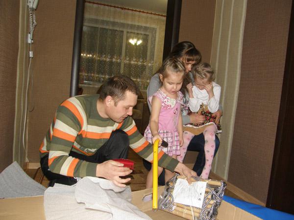 Папа - Андрей Евгеньевич - после получения посылки от Деда Мороза помог девочкам распаковать ее. Ко всеобщему удовольствию, за короткое время собрал велотренажер, а впоследствии закрепил и шведскую стенку.