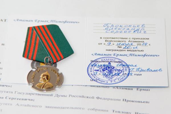 Ведомственная медаль «Атаман Ермак», утвержденная Геральдической комиссией по делам казачества при Президенте РФ была вручена парламентариям от имени атамана Сибирского казачьего войска.